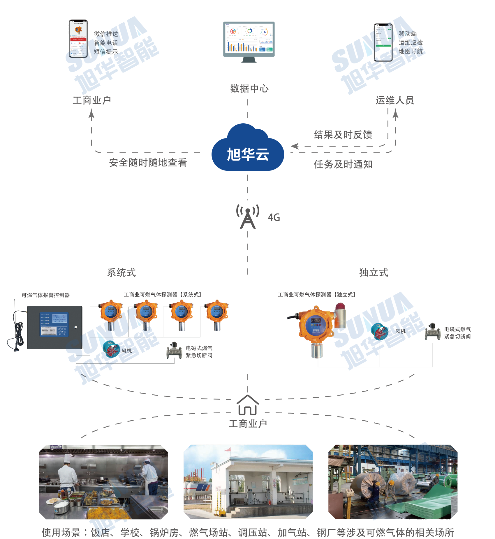 基于物联网技术,实现工商业场所用气安全的实时远程监控,一旦气体浓度超过报警设定值,报警器将实时发出声光报警信号,提醒现场人员迅速采取有效措施,有效避免火灾、爆炸、窒息等恶性事故发生,科技守护工商业户安全。